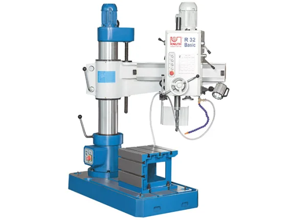 As an entry-level model, this radial drilling machine offers 32 mm (1.26 in) drilling capacity, 820 mm (32.28 in) throat and 860 mm (33.86 in) processing height. The model belongs to our R Basic series of classic radial drilling machines with manually switched gears and manual clamps. With their heavy weight they guarantee the best stability with an excellent price-performance ratio. Due to the easy handling of large workpieces and the robust design, we recommend these models for use in workshops and steel construction, among other applications. A cube table is part of the standard equipment for smaller workpieces.